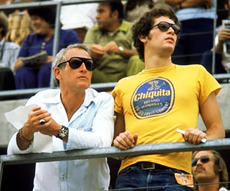 The idea has been put forth that Paul Newman started wearing the black dial Rolex stainless steel Daytona [Reference 6263] before he began wearing this white dialed one, but this is virtually impossible since I discovered a photo of him wearing his white dialed version in 1972 as pictured below with his son. I totally remember those, “Chiquita Banana” t-shirts from my childhood and think I had one, along with my Farah Fawcett poster =)